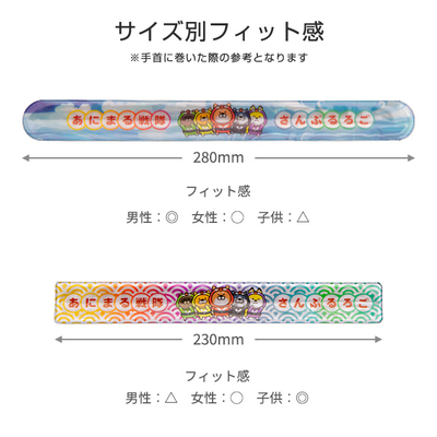 サイズ展開 | ①W230×H30mm (サークル型 / スクエア型) >国内で最も流通しているサイズです。手首へのつけ心地はタイトに感じますが、コンパクトでバッグの持ち手に巻き付けたり、手首や足首に装着する以外での用途にも適したサイズです。 ②W280×H30mm (サークル型 / スクエア型) >W230mm×H30mmと比較して手首へのつけ心地が柔らかく、運動中に使用する際も窮屈に感じにくいサイズです。手首や足首に巻いて使用する事が主な目的の場合はW280×H30mmがオススメです。 ②W300×H30mm (サークル型 / スクエア型) >二の腕にも巻きやすい長めのタイプです、春から秋にかけてランニングや散歩など軽装で二の腕に巻いて使用するならこのサイズがオススメです。 ②W320×H30mm (サークル型 / スクエア型) >冬場など防寒着の上から二の腕に巻く場合は、このサイズがオススメです。その他、長さを活かして足にも巻くことができます。※長い分フィット感は悪くなります。 |