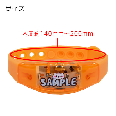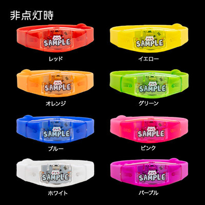 単色LEDタイプの光るブレスレットにオリジナル印刷をいたします。7種類のカラーバリエーションとサイズ調整バンド付き。