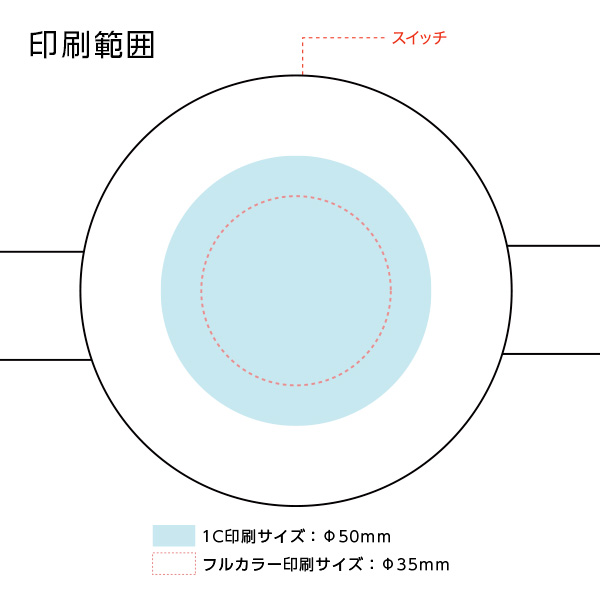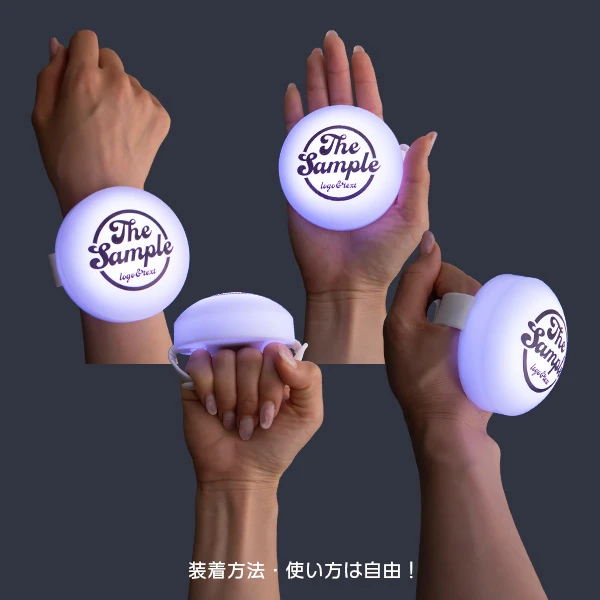 15色の発光カラーを切り替え可能なブレスレットです。直径50mmの広い印刷範囲にロゴや文字をフルカラーで印刷でき、視認性も抜群。